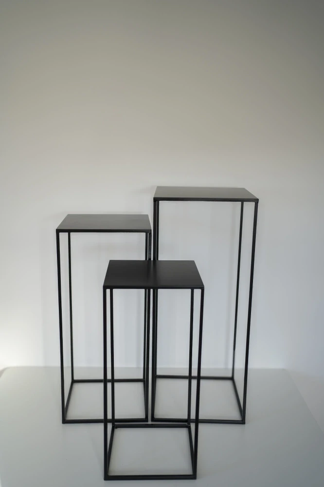 Černé kovové dekorační stojany. Jedna sada obsahuje tři různě vysoké stojany.